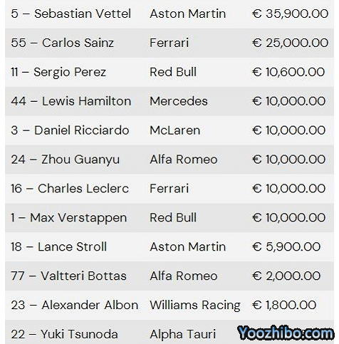 中国车手周冠宇在自己的第一个F1赛季也有很多的违规行为,他被罚10000欧元,与汉密尔顿、里卡多、勒克莱尔和维斯塔潘并列排名第四,汉密尔顿被罚款是因为奥地利大奖赛上,汉密尔顿的体能教练提前联系车手,所以被罚款。周冠宇是新秀赛季、菜鸟车手,他本赛季的薪水是97万欧元。