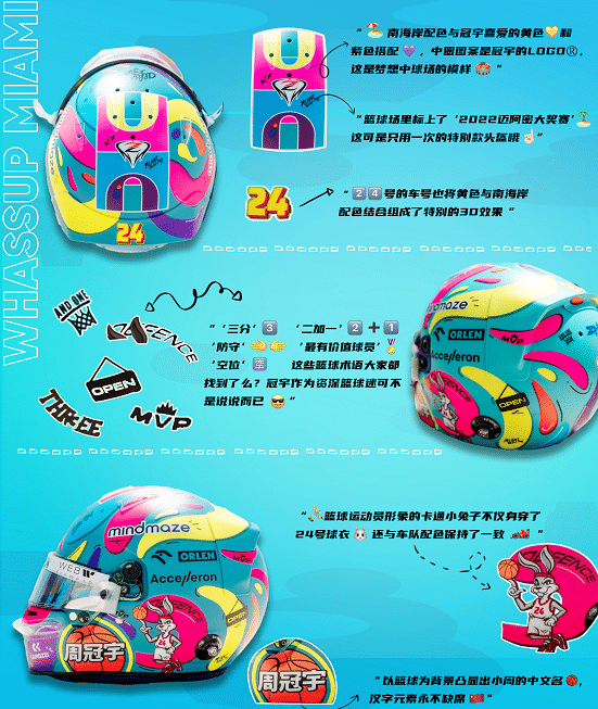 周冠宇已经在社交媒体上晒出了定制头盔涂装,他此前已经进行了预热,如今晒出头盔之后非常惊艳。其中缤纷的色彩和丰富的篮球元素,融合了迈阿密街头艺术和车手本人对篮球的热爱 ,都展现了迈阿密的特色。