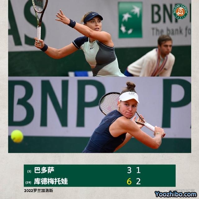 直播车讯 北京时间5月29日凌晨,2022年法网公开赛结束第七比赛日争夺。3号种子巴多萨迎战库德梅托娃,一上来巴多萨破发+保发取得了2-0的优势;结果库德梅托娃化解多个破发点保发拿下第三局之后,强势发挥,两次破发两次保发,连胜五局,以5-2领先,最终6-3拿下第一盘;