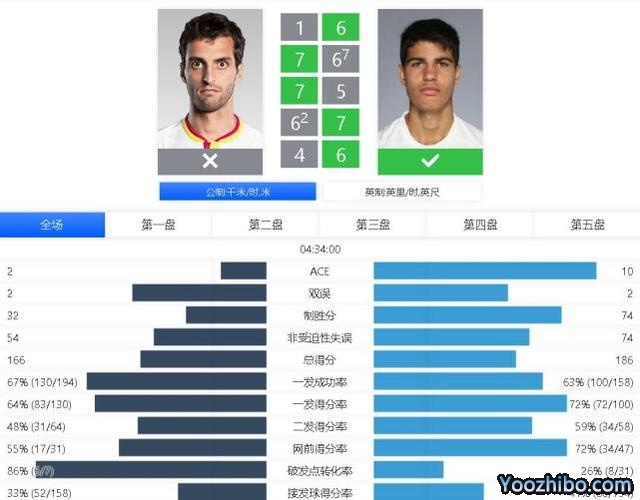 决胜盘阿尔卡拉斯在第2局遭到破发,开局0-3落后。第5局阿尔卡拉斯破掉对手发球局,随后保发追至3-3平。第7和第8局双方互破发球局,第9局阿尔卡拉斯再度破发,随后他连下4分保下发球胜赛局,6-4赢下决胜盘。