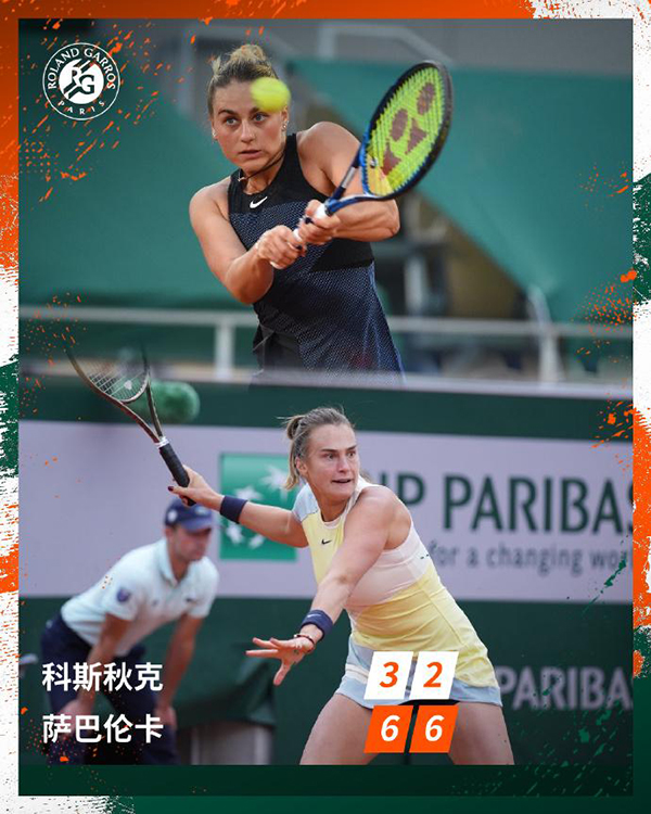直播车讯 北京时间5月28日,2023法网正赛首日正式打响,2号种子萨巴伦卡直落两盘击败了科斯秋克,尽管萨巴伦卡在第一盘率先被破发,不过她及时调整状态6-3、6-2晋级下一轮,下一轮她的对手将是白俄罗斯同胞、资格赛选手希玛诺维奇。
