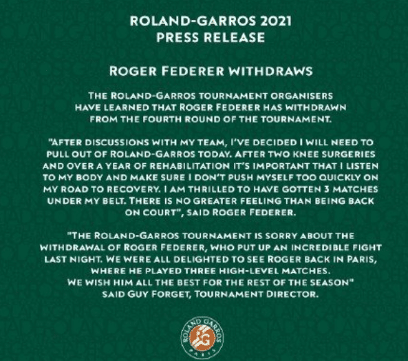突发!费德勒宣布退出法网,鏖战后身体亮红灯,或全力备战温网