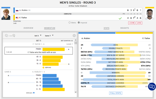 决胜盘,蒂亚福发挥出色,第2局,他就抓住第2个破发点,率先破发。在第3局错失2个局点保发后,他在第4局再度破发。第5局,美国人错失2个局点保发后,取得了5-0的领先。第6局,卢布列夫保发,拿下整场最后一局。随后,蒂亚福直落4球拿下发球胜赛局,以6-1赢下决胜盘,大比分3-2晋级第四轮。