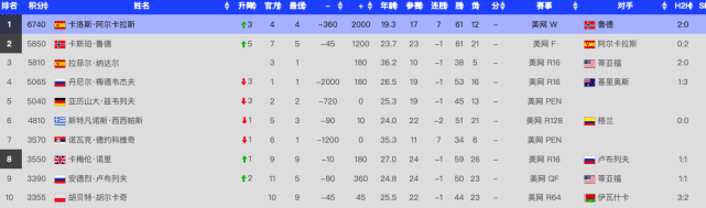阿尔卡拉斯目前的积分为6740分,领先优势巨大。而美网屈居亚军的鲁德则落后890分,以5850分排名第2。折戟美网的西班牙传奇巨星纳达尔无缘重返世界第1,他暂时落后鲁德40分,排名第3位。
