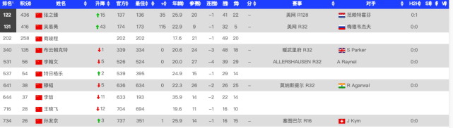 中国选手方面,打进美网正赛的双子星张之臻和吴易昺都刷新个人最高排名。其中爆冷打进32强创造历史的吴易昺以416分位列第131位,而止步首轮的张之臻则以20分的优势,排名第122位,继续保有“中国一哥”的称号。年轻的希望之星商竣程以258分排名第202位,即将跻身前200名。
