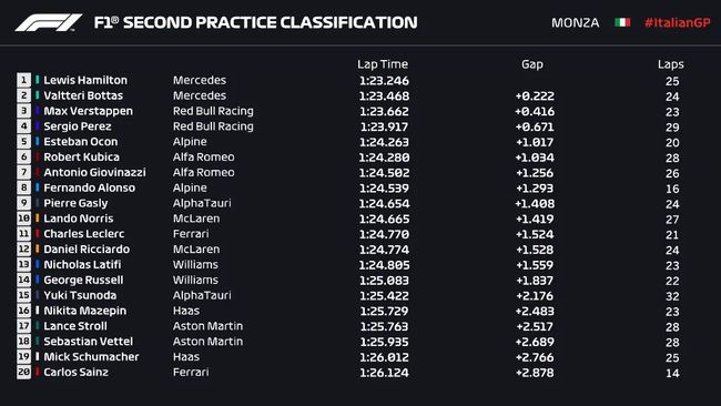 直播车讯 北京时间9月11日晚,2021F1意大利大奖赛第二次自由练习赛在蒙扎赛道正式落下帷幕。二练中,汉密尔顿、博塔斯分列一二,维斯塔潘第三。