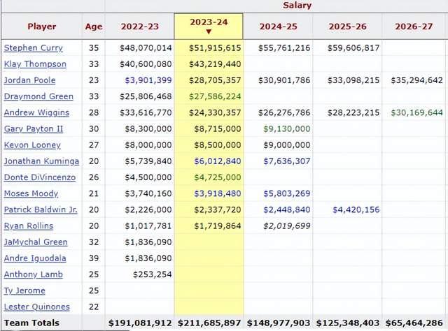 勇士本赛季的薪水是1.89亿美元,仅次于快船排名联盟第二。而下赛季,如果勇士保持现有的大部分球员,那么他们的总薪资将达到创纪录的2.117亿美元。其中有库里的5191万美元,汤普森的4322万美元,普尔的2870万美元,维金斯的2433万美元,追梦格林的2758万美元(今夏球员选项),小佩顿的871万美元,卢尼的850万美元,库明加的601万美元(球队选项),迪温琴佐的472万美元(球员选项),穆迪的392万美元(球队选项),鲍德温的234万美元,罗林斯的172万美元。