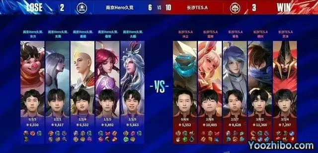 决胜局,南京Hero久竞蓝色方,拿到了镜+伽罗。长沙TESA红色方,拿到了澜+公孙离。开局南京Hero久竞击杀盾山,拿到一血。10分钟,长沙TESA盾山开到伽罗,一波一换三,长沙TESA直推中路一塔+下路高地。决胜团,长沙TESA先手击杀伽罗,一波直推水晶,拿下最终胜利。