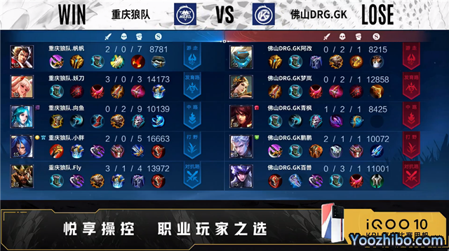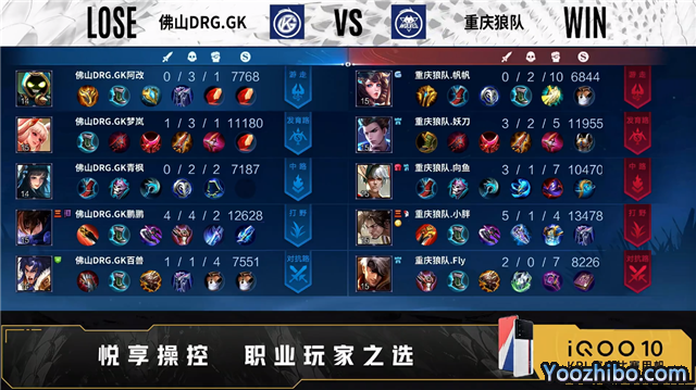 双方常规开局。2分20秒佛山DRG.GK拿下暴君。2分57秒佛山DRG.GK对抗路击杀王昭君拿到一血。5分20秒重庆狼队摧毁敌方发育路外塔。5分58秒佛山DRG.GK野区击杀王昭君。6分43秒重庆狼队拿下暴君。6分53秒佛山DRG.GK拿下主宰。7分55秒重庆狼队发育路击杀马超。8分14秒野区团战重庆狼队打出1换2。8分37秒重庆狼队摧毁敌方中路二塔。10分17秒重庆狼队拿下暗影暴君。10分54秒重庆狼队对抗路击杀周瑜。11分25秒重庆狼队摧毁敌方对抗路二塔。12分11秒重庆狼队拿下暗影主宰。14分08秒重庆狼队对抗路击杀马超。15分07秒重庆狼队拿下暗影暴君。16分02秒重庆狼队拿下暗影主宰。16分23秒重庆狼队对抗路击杀马超。16分59秒重庆狼队摧毁敌方中路高地塔。18分51秒重庆狼队拿下暗影暴君。21分32秒高地团战重庆狼队打出0换4。21分52秒重庆狼队摧毁敌方水晶拿下比赛。