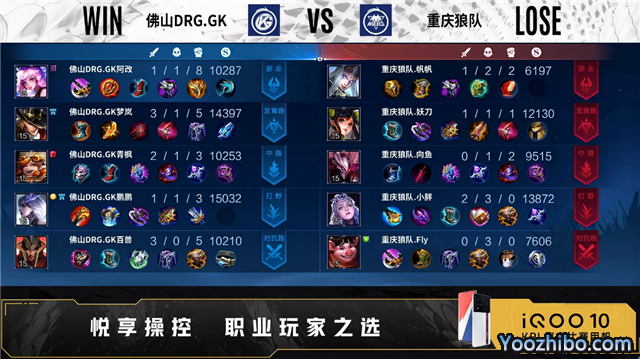双方常规开局。1分31秒野区团战重庆狼队打出0换2。6分18秒佛山DRG.GK摧毁敌方对抗路外塔。8分44秒重庆狼队对抗路击杀曜。8分54秒重庆狼队摧毁敌方对抗路二塔。10分38秒重庆狼队摧毁敌方中路二塔。11分08秒重庆狼队摧毁敌方对抗路高地塔。11分59秒重庆狼队拿下暗影暴君。12分38秒重庆狼队发育路击杀姜子牙。12分54秒重庆狼队摧毁敌方发育路高地塔。13分20秒重庆狼队摧毁敌方中路高地塔。14分04秒重庆狼队拿下暗影主宰。14分30秒高地团战重庆狼队打出1换3。15分03秒重庆狼队摧毁敌方水晶拿下比赛。