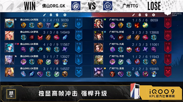 佛山DRG.GK五人抢中,44秒佛山DRG.GK反掉蓝BUFF,广州TTG阿古朵反掉红BUFF。53秒广州TTG暴君处击杀公孙离拿到一血。2分33秒野区团战双方游走位互换。3分27秒广州TTG发育路击杀公孙离。3分42秒对抗路双方1换1。3分45秒佛山DRG.GK发育路击杀孙尚香。5分 15秒广州TTG摧毁敌方对抗路外塔。5分24秒佛山DRG.GK野区击杀阿古朵。5分52秒佛山DRG.GK拿下暴君。8分49秒广州TTG拿下主宰。11分21秒广州TTG中路击杀公孙离。11分43秒广州TTG摧毁敌方中路外塔并击杀盾山。12分10秒广州TTG拿下暗影主宰。12分49秒广州TTG摧毁敌方对抗路二塔。16分10秒佛山DRG.GK拿下暗影主宰并击杀张飞。18分20秒佛山DRG.GK野区击杀孙尚香。19分08秒对抗路团战双方2换2。20分36秒龙王处团战佛山DRG.GK打出0换3。21分04秒佛山DRG.GK摧毁敌方中路外、二塔。21分52秒佛山DRG.GK强点水晶拿下比赛。