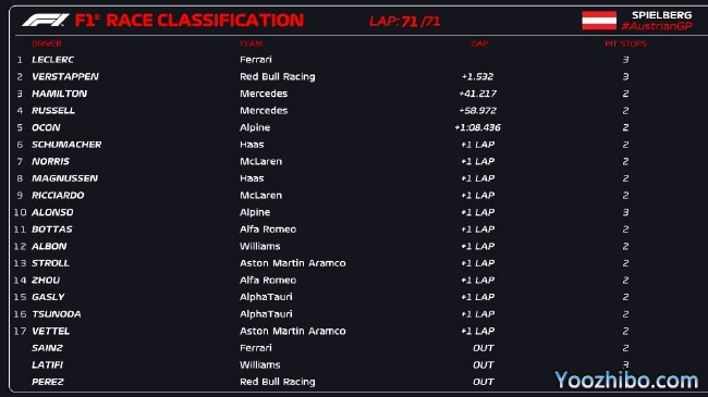 直播车讯 北京时间07月10日,2022年F1奥地利大奖赛正式比赛在红牛环赛道结束,法拉利车队勒克莱尔顶住红牛车队维斯塔潘最后时刻的追击,时隔七场比赛再次站上最高领奖台!这也是他生涯首次从非杆位发车拿到冠军!维斯塔潘亚军,梅赛德斯车队汉密尔顿季军。
