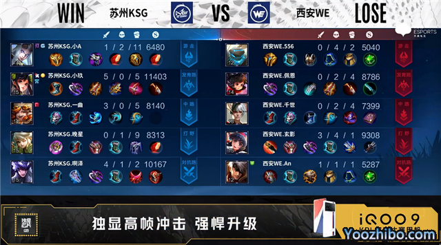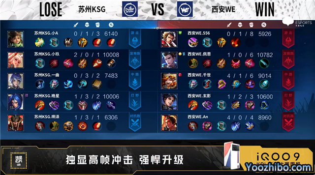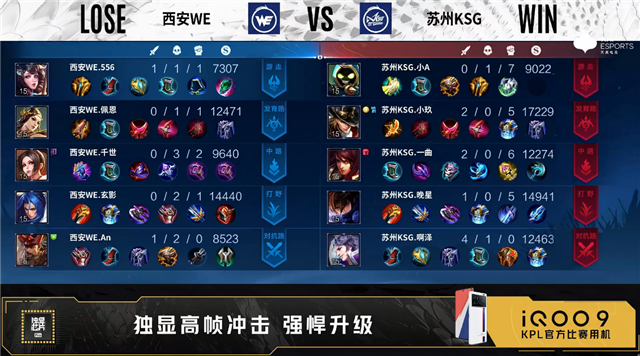 双方常规开局。1分04秒西安WE野区击杀太乙真人拿到一血。1分58秒苏州KSG中路击杀不知火舞。6分12秒苏州KSG野区击杀廉颇,西安WE摧毁敌方发育路二塔。7分15秒西安WE拿下主宰,苏州KSG拿下暴君。8分59秒西安WE摧毁敌方发育路二塔。9分40秒西安WE发育路击杀刘邦。9分55秒苏州KSG摧毁敌方中路外塔。10分40秒苏州KSG野区击杀虞姬并抢到暗影暴君。11分06秒苏州KSG摧毁敌方中路二塔。11分14秒发育路团战苏州KSG打出0换3。11分57秒苏州KSG拿下暗影主宰。13分20秒苏州KSG对抗路击杀廉颇。13分29秒苏州KSG摧毁敌方对抗路高地塔。15分48秒苏州KSG拿下暗影主宰。18分14秒苏州KSG拿下暗影暴君。18分35秒苏州KSG发育路击杀橘右京。19分05秒苏州KSG摧毁敌方水晶拿下比赛。