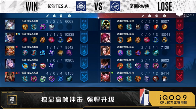 开局济南RW侠李元芳中路抢线。2分28秒长沙TES.A发育路击杀金蝉拿到一血。5分22秒济南RW侠中路击杀不知火舞。7分38秒济南RW侠拿下暴君。9分36秒长沙TES.A中路击杀金蝉。10分13秒济南RW侠拿下暗影主宰。10分21秒长沙TES.A中路击杀金蝉。12分20秒长沙TES.A中路击杀曜。14分01秒中路团战长沙TES.A打出0换2。14分23秒长沙TES.A摧毁敌方中路外、二塔。15分51秒长沙TES.A拿下暗影暴君。16分23秒长沙TES.A摧毁敌方发育路二塔。17分30秒济南RW侠野区击杀虞姬。17分47秒济南RW侠摧毁敌方中路二塔。22分35秒中路团战长沙TES.A打出1换4。23分05秒长沙TES.A团灭对手摧毁水晶拿下比赛。