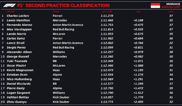 直播车讯 北京时间5月25日,F1摩纳哥站二练结束,勒克莱尔全场最快,汉密尔顿、阿隆索二三带回,索伯双车位居19,20。