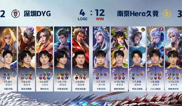 前期双方平稳发育,南京Hero久竞控下暴君。5分30秒,深圳DYG丶阿改 (杨廷普)张飞大招控到孙尚香,深圳DYG丶流星 (李星)夏洛特拿到一血,后续深圳DYG丶青枫 (杜舟)不知火舞控到三个人再次击杀对方游走。6分40秒,深圳DYG丶钎城 (周诣涛)狄仁杰闪现接黄牌控到孙尚香,配合深圳DYG丶夏凌 (张蜀徽)夏侯惇击飞造成击杀,双方二换二。7分30秒,南京Hero铃铛 (王稳强)甄姬躲掉关键伤害反杀夏洛特,南京Hero久竞推掉对方中路一塔。