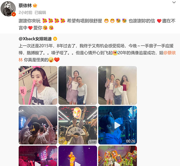 姚迪在社交媒体上晒出了自己观看蔡依林演唱会的动态,感慨时隔8年再度观看蔡依林的演唱会,胳膊酸了,嗓子也喊哑了,非常开心可以追星成功。同时姚迪还晒出了自己与蔡依林合影的照片,非常开心。