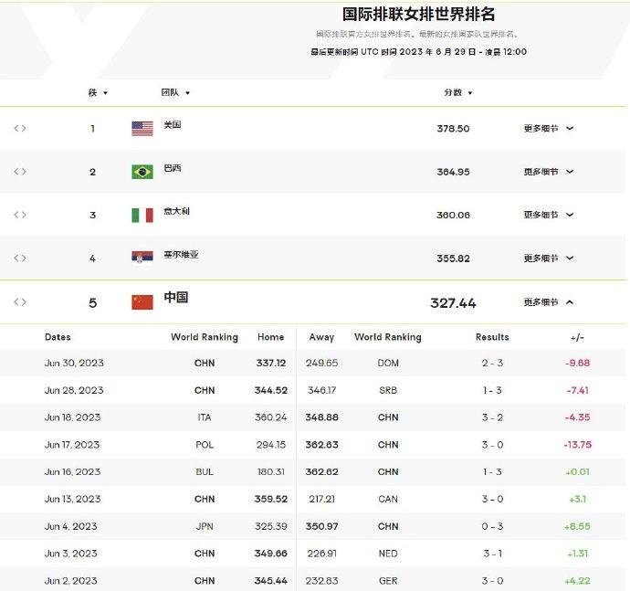 而在输给多米尼加之后,中国女排世界排名积分减少9.68分,以327.44分继续排名第五,不过只比排名第六的土耳其只多了3.36分。前五名的位置,已经变得岌岌可危。
