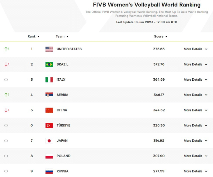中国女排的世界排名再度回到第五名,世联赛第一周的4连胜之后排名飙升到前三,但可惜一波两连败让积分下降接近20分,排名也再度回到第五。这也让郎平此前的言论成真,多年前郎平对于中国女排的点评是:“我们就是世界第五六名的水平。”