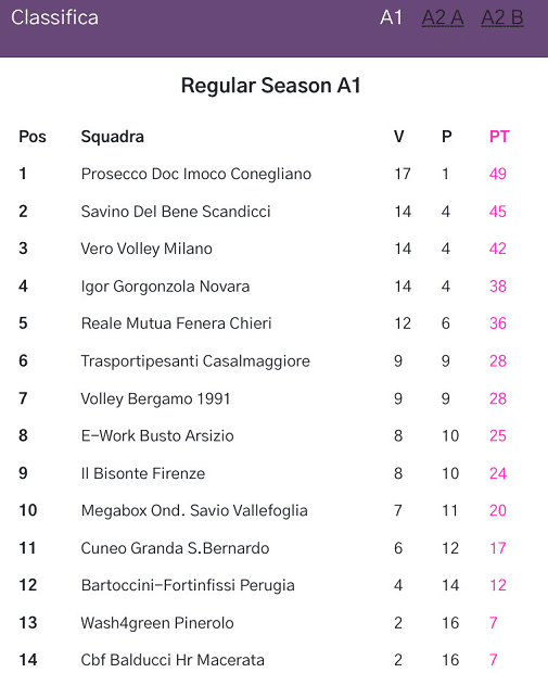 来源:直播车02-16 21:16直播车讯02月16日意甲第18轮已经正式落下帷幕,意大利女排联赛一共有26轮,如今仅剩8轮,各队的竞争还是很激烈的,有力争常规赛冠军,也有卡位需求的队伍,还有的球队力争保级。目前科内利亚诺以17胜1负排名第一,朱婷和姚迪所在的斯坎迪奇位居第二,缪伊雯新东家皮内罗洛处于降级区,排名倒数第二。按照意甲的规则,1-8名参加季后赛,倒数两名球队降级到意乙联赛。