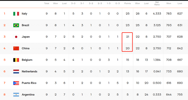 中国女排在小组赛输给意大利之后,最后一场面对比利时的比赛,至少要拿下两局。好在中国女排不负众望,最终3-0轻松击败对手。晋级8强对于中国女排来说,显然只是第一个需要达成的目标。但由于之前3-2击败荷兰的比赛损失了积分,丧失了争夺小组第三的主动权。果不其然,斗志旺盛的日本女排也3-0零封荷兰女排。