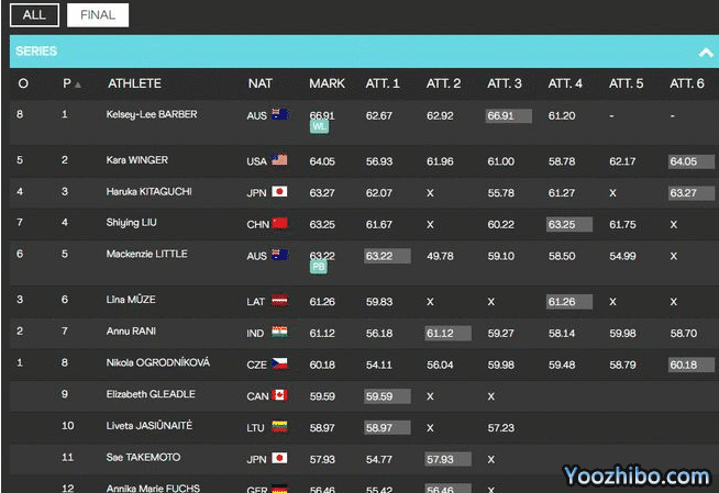 本场比赛,众多选手在前5投中的表现都比较平淡,除了澳大利亚选手巴贝尔投出66米91之外,其余选手都未能超过64米。中国选手刘诗颖在第四枪投出了63米25,在前5轮投掷结束之后,排名第二位。但是没有想到,在最后一投中,多名选手投出了最佳成绩。