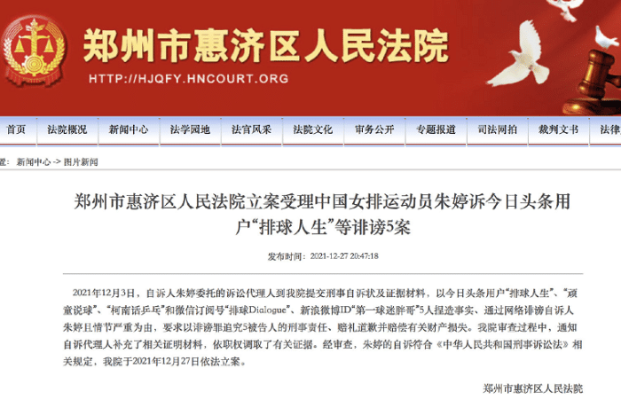 来源:直播车12-28 10:40直播车12月28日讯 近日中国女排队长朱婷维权的事情吸引了很多人的关注,有5名网友、自媒体在针对进行造谣。其实朱婷在8月11日就报警了,到了12月27日,朱婷的报警已经正式被立案受理,希望这些造谣者可以承担刑事责任、赔礼道歉并赔偿有关财产损失。这件事情一出,不少人表示朱婷的做法是对的,面对这些无中生有的造谣者,就是需要拿起法律的武器来维权。
