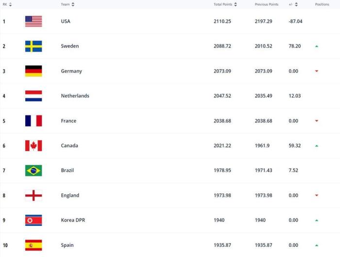 来源:直播车08-21 09:58直播车讯 今日,FIFA最新一期排名更新,中国女排排在世界第17名,亚洲第4名。可能是受奥运会战绩影响,与此前6月25日发表的世界排名相比,中国女足下降2位。