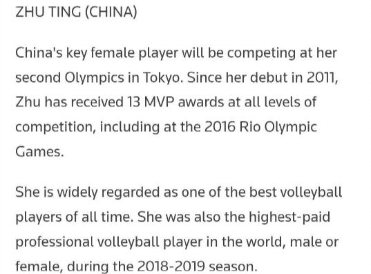 “朱婷被认为是排球历史上最优秀的运动员之一,她在2018-19赛季成为排球项目上,包括男女排在内薪资最高的球员”。