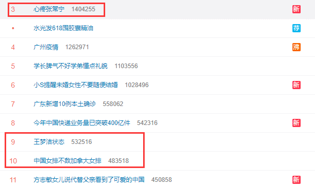 这场比赛结束之后也直接刷屏,很快中国女排的多个相关话题就霸占热搜榜的前列,其中包括了“心疼张常宁”、“王梦洁状态”和“中国女排不敌加拿大女排”,加起来的实时搜索人数高达数百万,说中国女排是顶流,丝毫不为过。