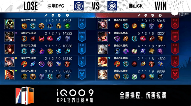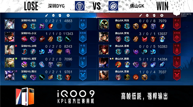 开局深圳DYG中路、发育路换线。1分整佛山GK主宰处击杀吕布拿到一血。1分29秒深圳DYG对抗路打出1换2。3分33秒佛山GK对抗路击杀橘右京。4分11秒佛山GK拿下暴君。5分52秒佛山GK发育路击杀狄仁杰。7分24秒深圳DYG野区击杀镜。10分18秒中路团战佛山GK打出0换2。11分58秒佛山GK拿下暗影暴君。12分11秒佛山GK发育路击杀橘右京。12分22秒佛山GK摧毁敌方中路二塔。12分51秒双方中路1换1,佛山GK摧毁敌方中路高地塔。13分36秒暴君处团战佛山GK击杀狄仁杰。13分59秒佛山GK发育路击杀橘右京。14分30秒深圳DYG发育路击杀虞姬。17分49秒高地团战佛山GK打出0换2。18分31秒高地团战佛山GK打出1换2。20分53秒佛山GK拿下风暴龙王。22分27秒佛山GK摧毁敌方水晶拿下比赛。