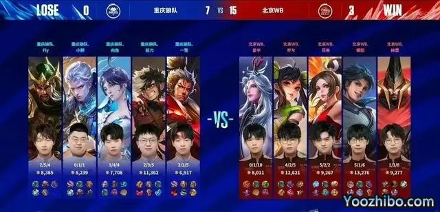 第一局,北京WB蓝色方,拿到了宫本武藏+公孙离。重庆狼队红色方,拿到了镜+戈娅。开局北京WB击杀夏侯惇,拿下一血。5分钟,重庆狼队妖刀戈娅绕后带走弈星,一波一换三,直推中路一塔。12分钟,北京WB暖阳镜切到后排,带走对面射野。决胜团,北京WB连破三路高地,一波团灭重庆狼队,直推水晶,先下一局。