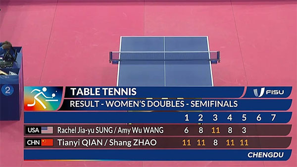 这是成都大运会乒乓球女双半决赛,钱天一和赵尚的组合以4-1击败美国队的宋家瑜和王艾米。比赛最为精彩的是第二局,当时美国组合抢开局拿到8-2的领先,占据绝对优势。
