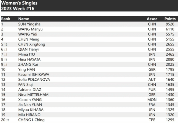 来源:直播车04-18 10:32直播车04月18日,国际乒联第16周排名更新,因为上周有积分很高的新乡冠军赛,所以排名有很大的变化。整体上来看,国乒世界排名无悬念领跑,5项第一,樊振东和孙颖莎依旧是最大赢家。女单的陈幸同反超伊藤美诚,升至前五。