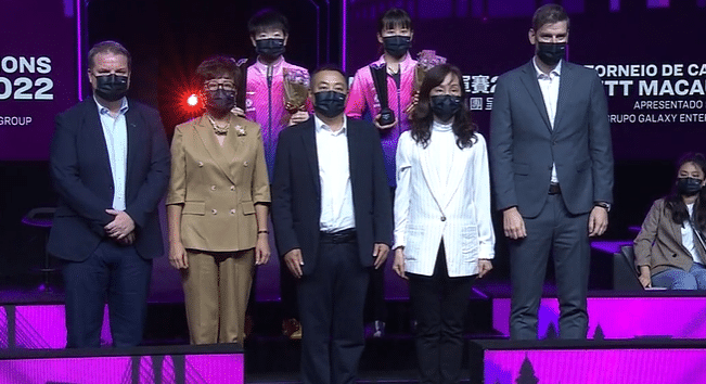 刘国梁为孙颖莎颁发冠军奖杯,一起合影,恭喜。