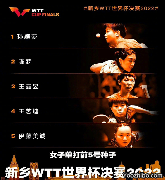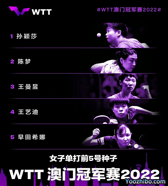 女子单单前五的种子选手是:孙颖莎、陈梦、王曼昱、王艺迪和早田希娜(确定缺席)