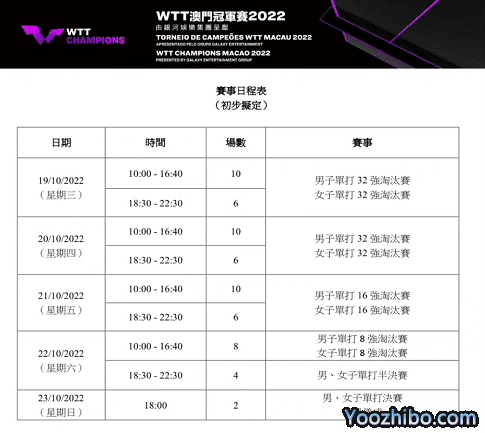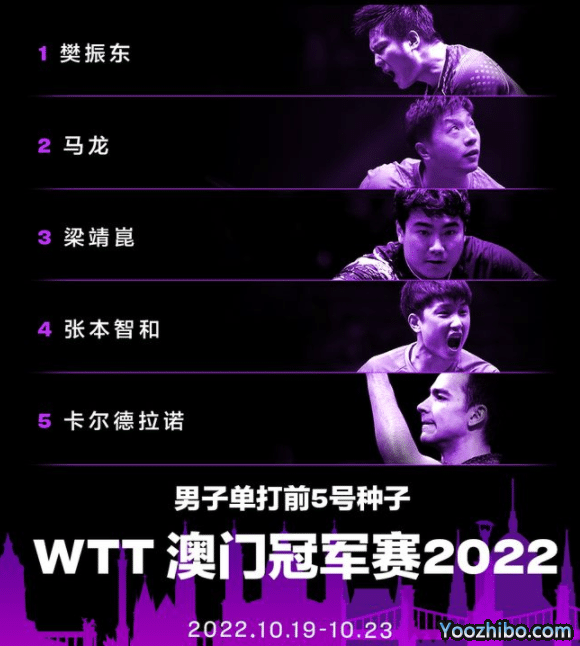 澳门冠军赛的举办时间是10月19日到10月23日,比赛场地是澳门塔石体育馆。男子单打前五的种子选手是:樊振东、马龙、梁靖崑、张本智和、雨果。
