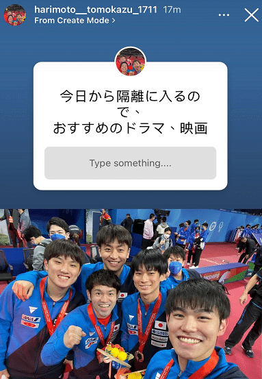 如今张本智和回国开启隔离,他在社交媒体上晒出了颁奖之后全队合影的照片,同时配文:“从今天开始隔离生活,请大家推荐电视剧、电影”