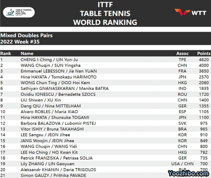 值得一提的是,在混双层面,许昕和刘诗雯的“昕雯联播”组合位居世界排名第八,两人已经逐渐淡出国乒的阵容当中,比如成都团体世乒赛,将没有许昕和刘诗雯的名字,他们的年龄也偏大,而后起之秀也不少。不过两人的积分还是很高的,他们在东京奥运会拿下混双银牌,在2022年初进行的WTT澳门冠军赛夺得冠军,这样的表现依旧可以让他们在排名上位居前列。