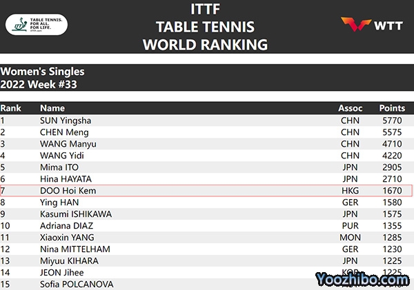 根据2022年8月15日国际乒联发布的最新的第33周女单排名中,杜凯琹以1670积分排名第7。