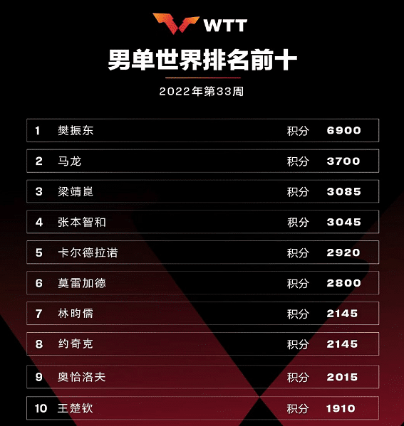 来源:直播车08-16 15:26直播车08月16日讯 ,国际乒联第33周排名正式出炉,本周男单和女单前十的名次没有太大的变动,男单层面依旧是樊振东第一,力压马龙。女单层面,孙颖莎第一,陈梦第二,王曼昱和王艺迪分居后面。值得一提的是国际乒联进行纠错,樊振东拿回了属于自己的1400分,此前他被扣1400分被附0分,当然积分上樊振东依旧有巨大的优势,稳居男单榜首。