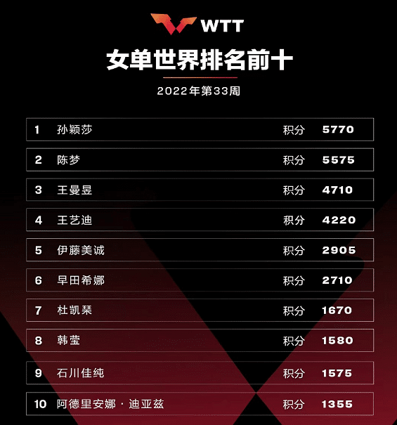 孙颖莎和陈梦之间的分差很小,两人在2022年都有过比较长时间霸占世界第一的位置,孙颖莎通过布达佩斯的表现夺得世界第一的位置,但可惜在女单的层面,孙颖莎的整体表现不如陈梦和王曼昱等人。