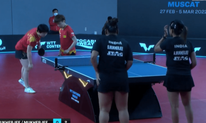 第二局,国乒组合开局遇到麻烦,蒯曼连续失误,对手7-2拉开比分。印度组合把握优势,以11-8扳回一局。