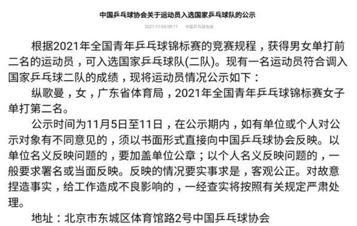 根据乒协官网的描述,获得男女单打前二名的运动员,可入选国家乒乓球队(二队)。而在此次全国青年乒乓球锦标赛中,男单冠亚军分别是向鹏、林诗栋,两人此前已经是国家队成员。女单冠亚军分别是蒯曼和纵歌曼,蒯曼此前也入选了国家队,因此只有纵歌曼符合上调的条件。
