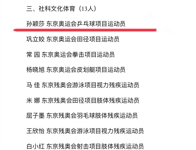 根据石家庄市的文件显示,孙颖莎等13名社科文化体育类人员,成为上榜者。其中孙颖莎的身份是“东京奥运会乒乓球项目运动员”。除了孙颖莎之外,田径铅球名将巩立姣也入选这份名单。