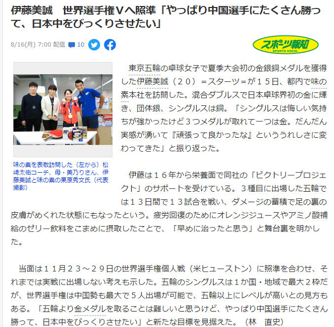 来源:直播车08-16 16:03直播车讯 伊藤美诚近期又放出豪言,根据《NHK》的报道显示,伊藤美诚在8月15日参加活动的时候,展望了在11月份进行的世乒赛,这位在奥运会上拿下1金1银1铜的乒乓球选手直言自己已经累计了很多的经验,将会击败中国队的选手,令全日本吃惊:“在世乒赛上希望能做更多事情,再次挑战中国选手,我希望在世乒赛上能击败很多中国选手,让全日本的观众都大吃一惊。”