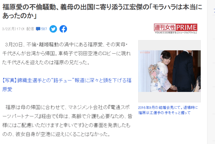 来源:直播车03-23 10:56直播车3月23日讯 ,日本媒体《女性周刊》发表一篇评论文章。文章的标题是:福原爱事件中,护送丈母娘回国的江宏杰真的有“情感暴力”吗?在文章中,作者为江宏杰“鸣冤”,称从种种迹象来看,江宏杰不太像会用言语暴力来对待福原爱的人。此外,作者也分析可能是异域的生活,以及对于婚姻太理想化,让福原爱的婚后生活并不甜蜜。