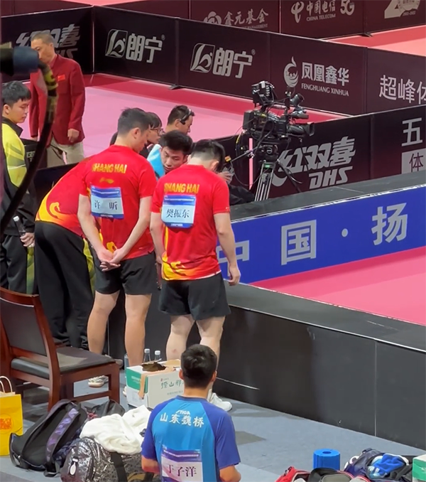 在上海队3-0山东队期间有一幕很有趣,队友在比赛中,樊振东和许昕在场边站起来,樊振东踢开了身前的广告牌,直接裂了。许昕也看到了,但他没有说话,随后樊振东自己赶紧修复好了,没有问题。之后樊振东还和许昕说着什么,估计是调侃这个广告牌质量不好。