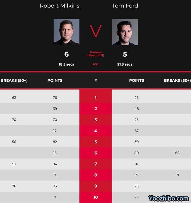 第五局,米尔金斯凭借单杆轰出56分的表现以82:30拿下此局比赛的胜利从而以3-2继续领先汤姆福德。第六局,汤姆福德凭借单杆打出68分的出色表现以80:15拿下此局比赛的胜利从而以3-3再次战平米尔金斯。第七局,米尔金斯凭借单杆打出53分的表现以84:4拿下此局比赛的胜利从而以4-3继续领先汤姆福德。第八局,汤姆福德凭借单杆打出71分的绝佳表现直接零封米尔金斯从而以4-4战平后者回归同一起点。第九局,米尔金斯凭借单杆轰76分的表现93:25拿下此局比赛的胜利从而以5-4领先汤姆福德率先拿到赛点。第十局,汤姆福德单杆60分77:0拿下此局5-5战平米尔金斯。第十一局,米尔金斯单杆74分拿下此局比赛以6-5绝杀汤姆福德晋级。