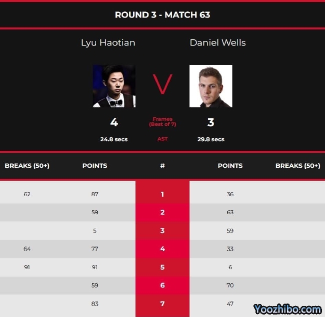 决胜局中,双方在清红之后陷入了僵持。此时,吕昊天以60-20领先,台面上只剩27分。双方围绕黄球做斯诺克,吕昊天被罚了12分,丹尼尔-威尔斯也被罚了8分。此后双方继续在解球中被罚分,最终,吕昊天在78-47领先时打进蓝球,从而以83-47胜出,大比分4-3艰难晋级第三轮。